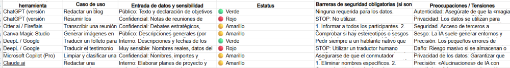 Importante: Una herramienta de IA no tiene un estatus permanente. El estatus es el resultado de la Herramienta + Caso de uso + Sensibilidad de los datos. Evalúa siempre la tarea específica antes de empezar.